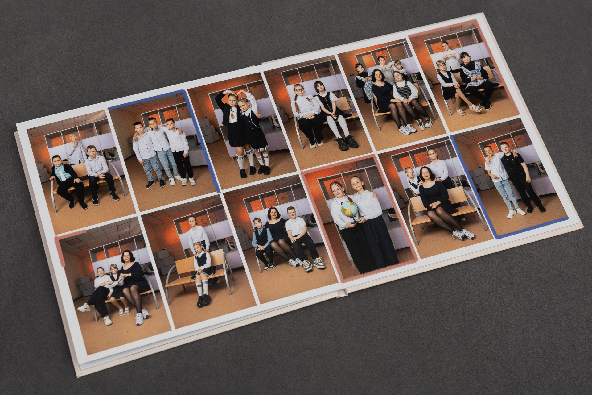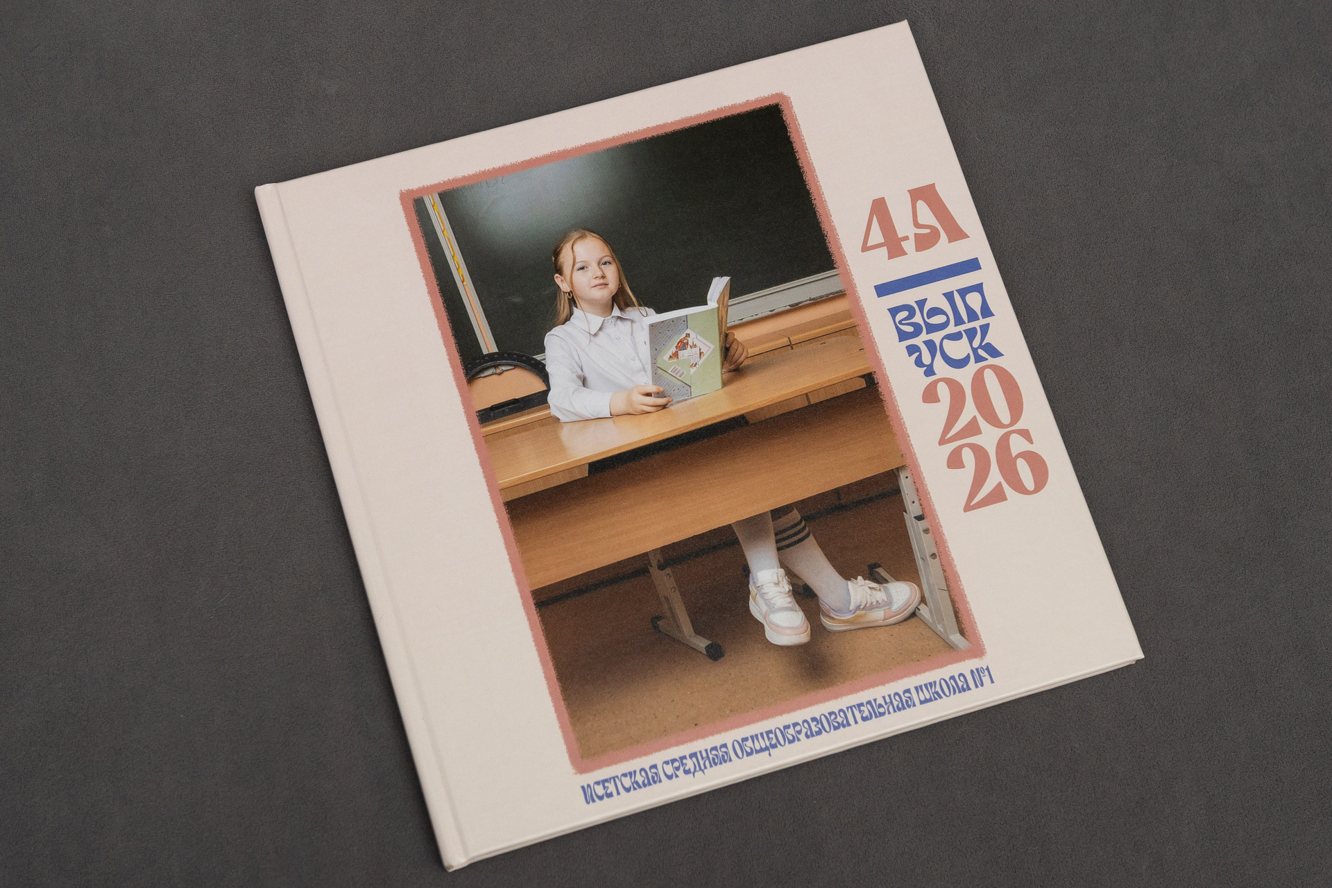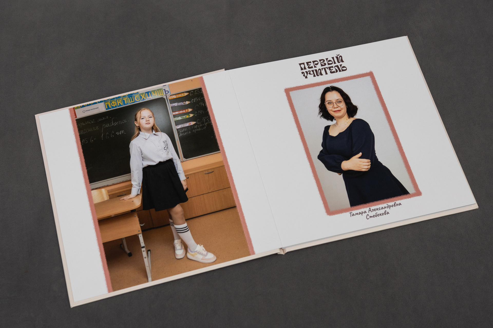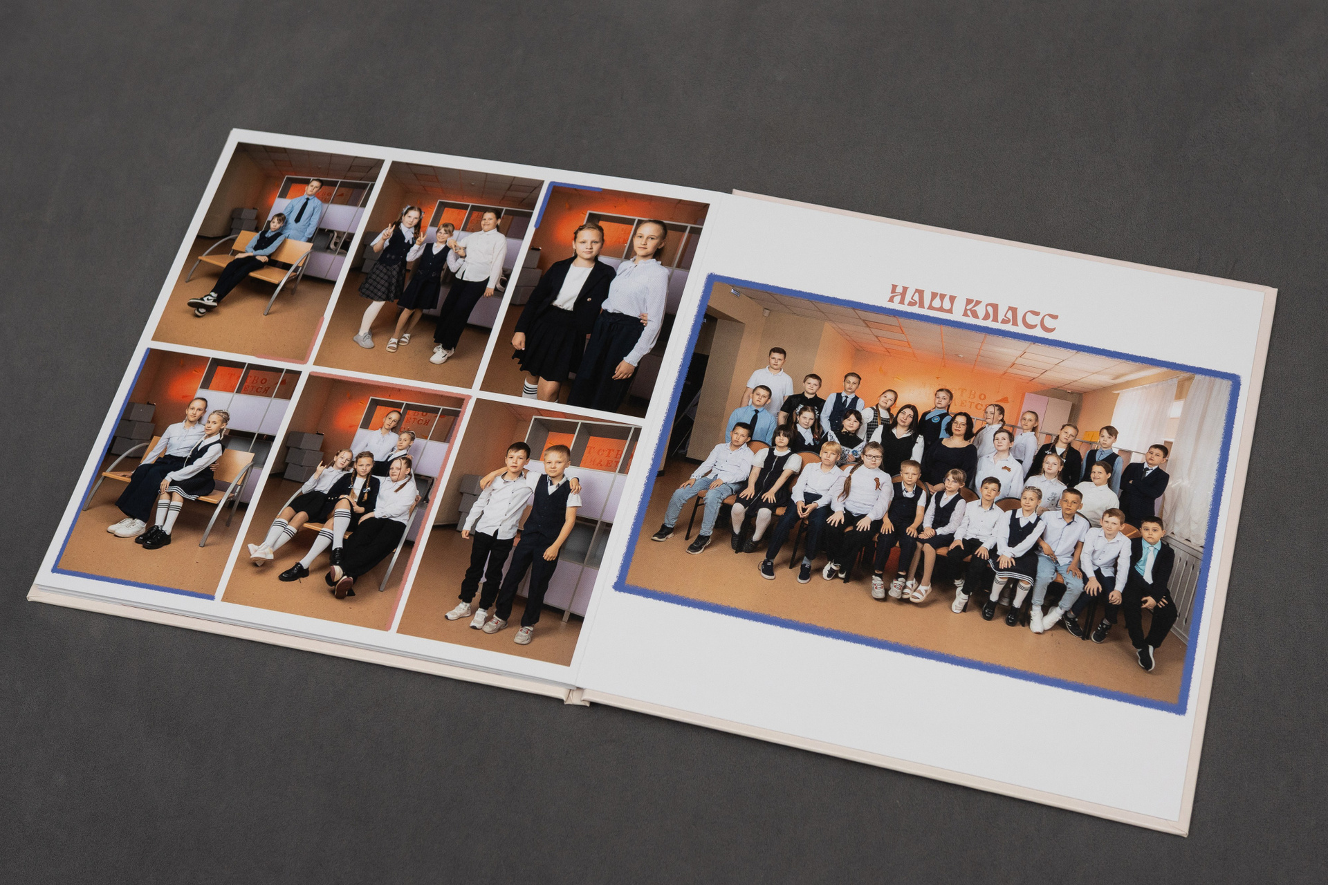 Классический дизайн выпускного альбома с акцентными элементами. Ненавязчивый дизайн не будет отвлекать от фотографий ребят, а будет выигрышно их подчеркивать.
